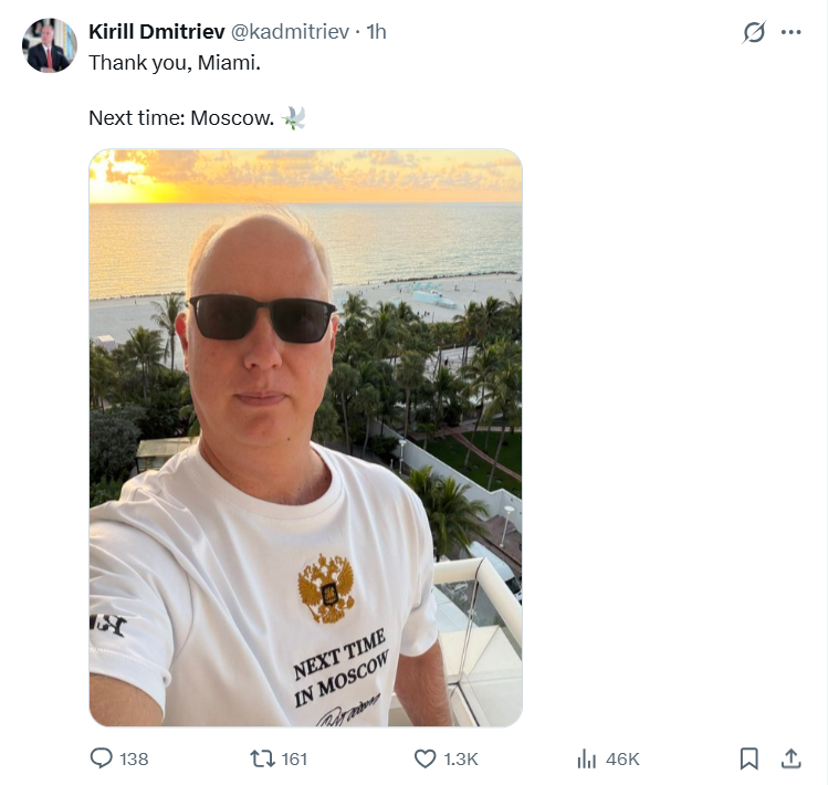 当地期间21日,德米特里耶夫在应付平台X上发布了一张以迈阿密日落为布景的自拍照。相片中,他身着一件印有俄罗斯国徽的白色T恤,T恤上印有 “下次莫斯科见” 的字样以及俄罗斯总统普京的签名。据报说念,此前在阿拉斯加会晤本事,普京曾用这句英文原话邀请好意思国总统特朗普赴莫斯科举行会谈。